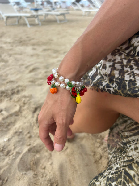Questo bracciale è un vero inno all’estate! Le perle si alternano a piccoli frutti in vetro di murano.