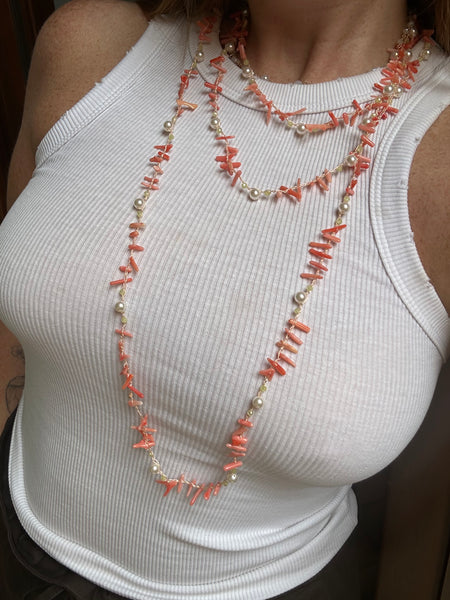 Questa meraviglia di collana con chips di corallo e perle, non può mancare nel tuo portagioie! Lunga 190cm infilata all’uncinetto placcato oro rosa, puoi portarla a 3/4 giri e anche come bracciale! STUPENDA 🪸