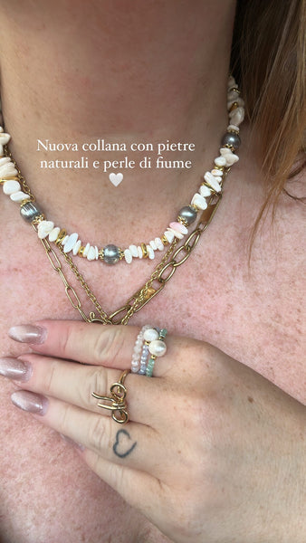 Perle di fiume, quarzo bianco, perla di acqua dolce grigia, pepite gold 18kt. Made in Italy.
