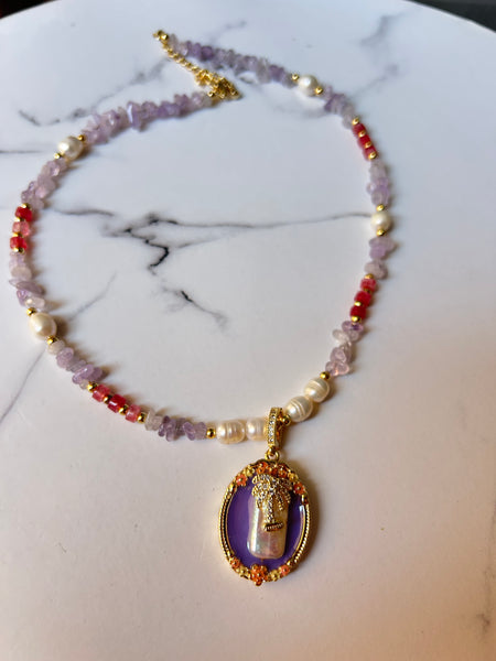 Ametista è da sempre una pietra che protegge con saggezza, unita a pepite di granito, ha il potere di donare energia positiva e pace. Ma il tocco meraviglioso di questa collana è il ciondolo con palma zirconata e incastonata su una base lilla dipinta a mano.