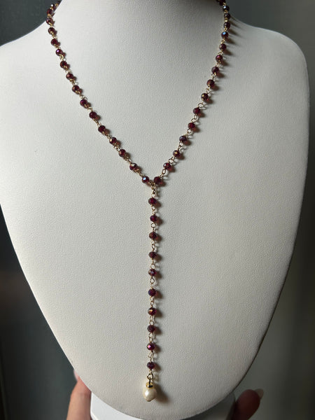 Meravigliosa collana a Y con cristalli color burgundy e perla di fiume finale. Argento925 placcato gold 18kt, anallergico e Made in Italy