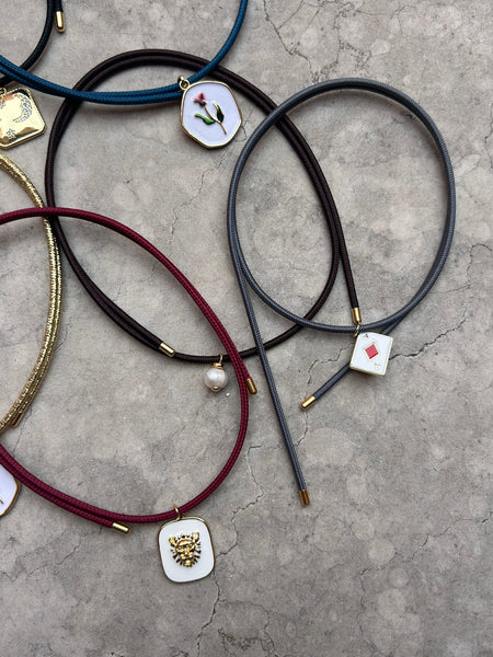 Raso di cotone con all’interno un’anima di calamita, puoi regolarlo come vuoi: collana, chocker, bracciale. Diventa quello che vuoi quando vuoi! Comodissimo da allacciare e regolare, non ha bisogno di una chiusura perché è automatica. Da indossare con o senza ciondolo.