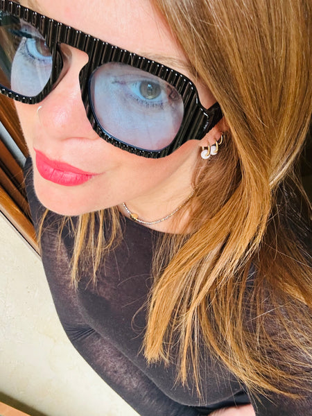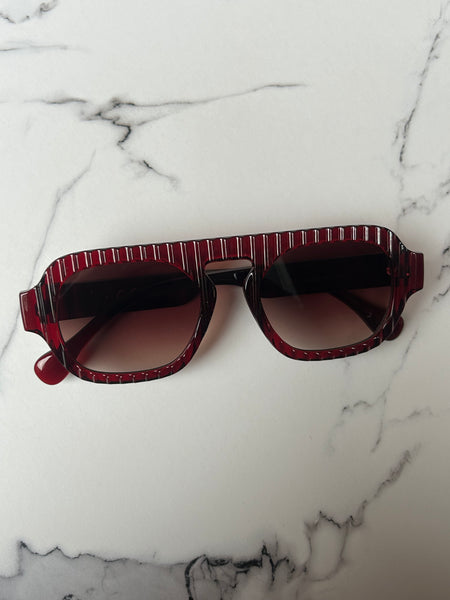 Occhiale a maschera molto particolare e di carattere. Montatura lavorata a righe e lente sfumata, perfetto per un look urban chic.