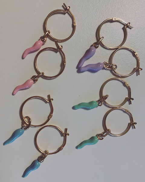 Orecchini con Cornetto portafortuna in argento 925, bagnato in oro rosa 18 kt, e smalto colorato.