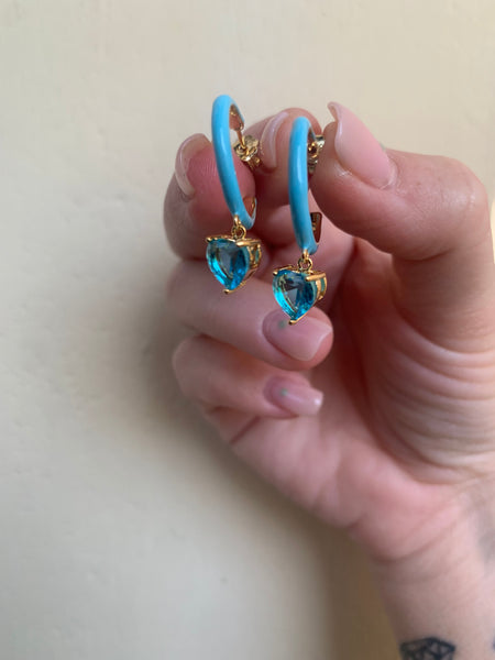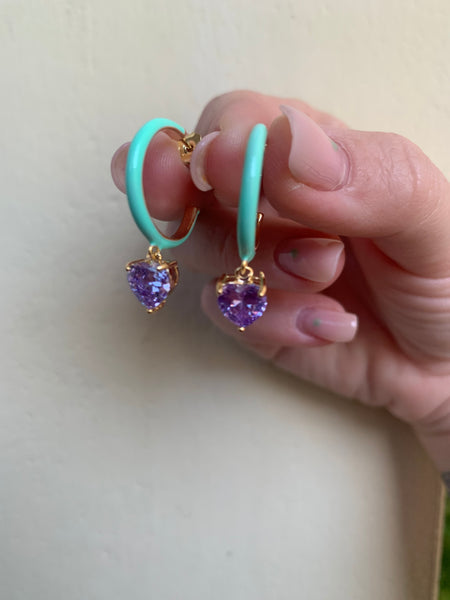 Orecchini a cerchio modello CrazyLove, in argento925 e smalto colorato con ciondolo a cuore cubic zirconia. Disponibile in vari colori.