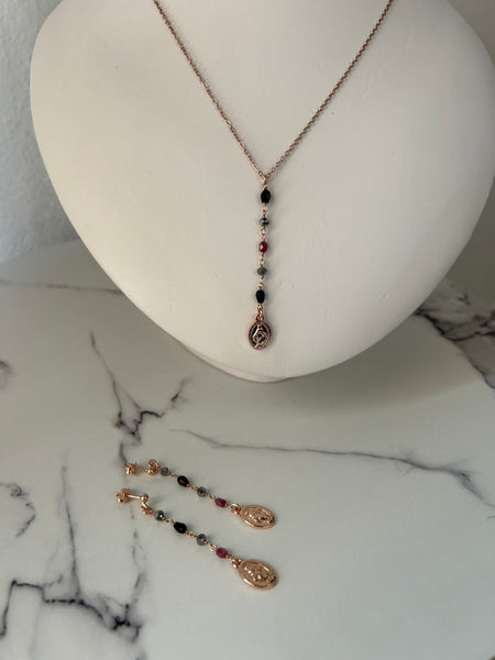 Orecchini a lobo con madonnina e cristalli dai toni del verde e grigio…una meraviglia! Un simbolo di amore e protezione.
