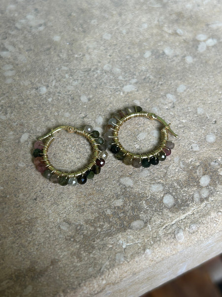 Orecchini realizzati a mano con pietre naturali e semipreziose, come la tormalina. Cerchio con chiusura a graffetta, comodi, leggeri e super glamour.