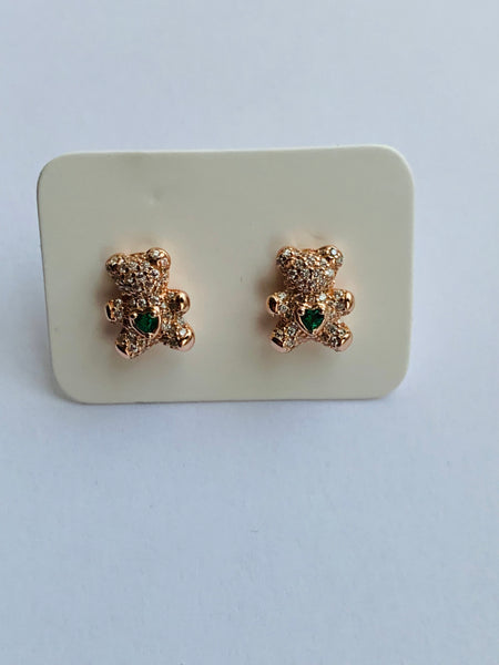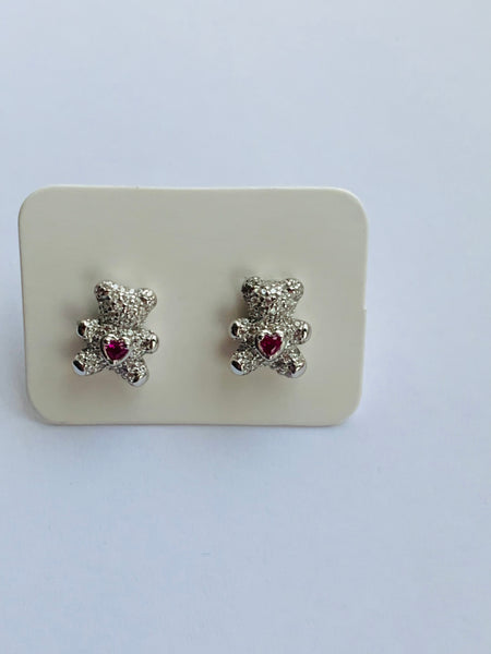 Dolcissimi orecchini a lobo in argento925 e zirconi, disponibili in rosè o argento bianco. Dettaglio con cuoricino smeraldo o rubino sintetico sul petto dell’orsetto.